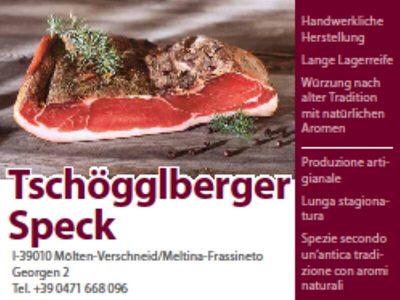 The long shelf matured Tschögglberger bacon is seasoned according to old tradtion with natural flavours and aroma and gets its special savour through hand crafting. You shouldn't miss the opportunity to taste this special local delicacy.