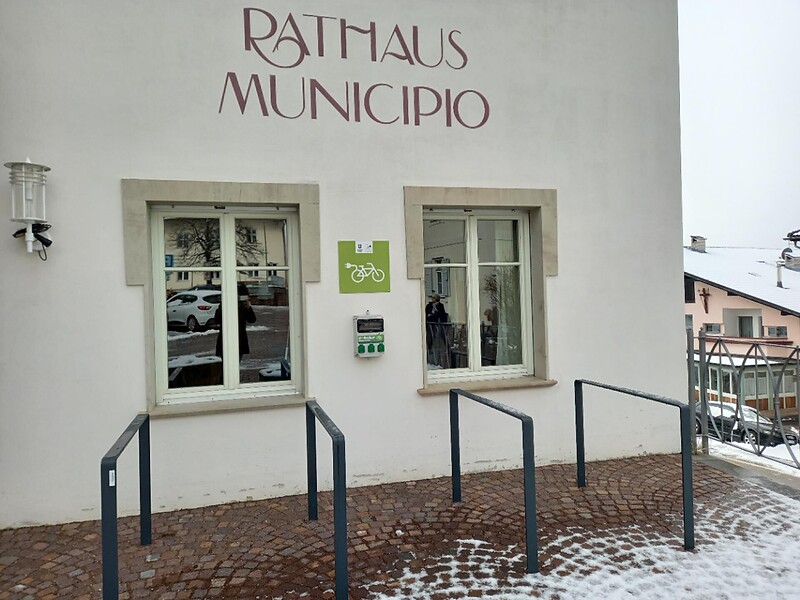 Charging station for e-bikes on the village square in Aldino in front of the municipality